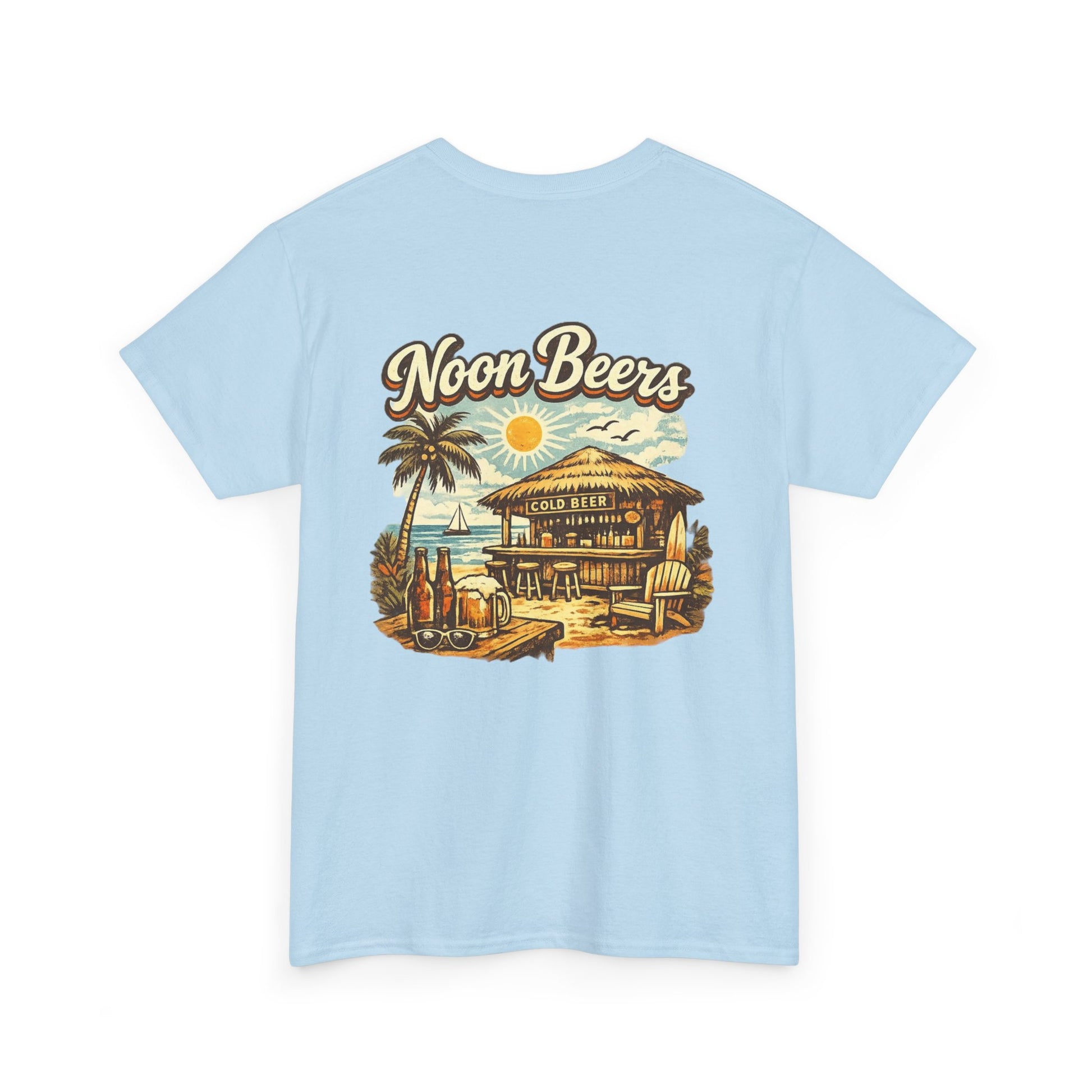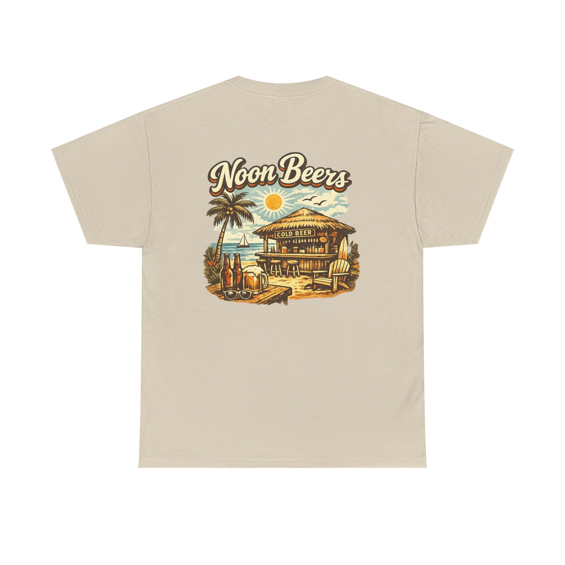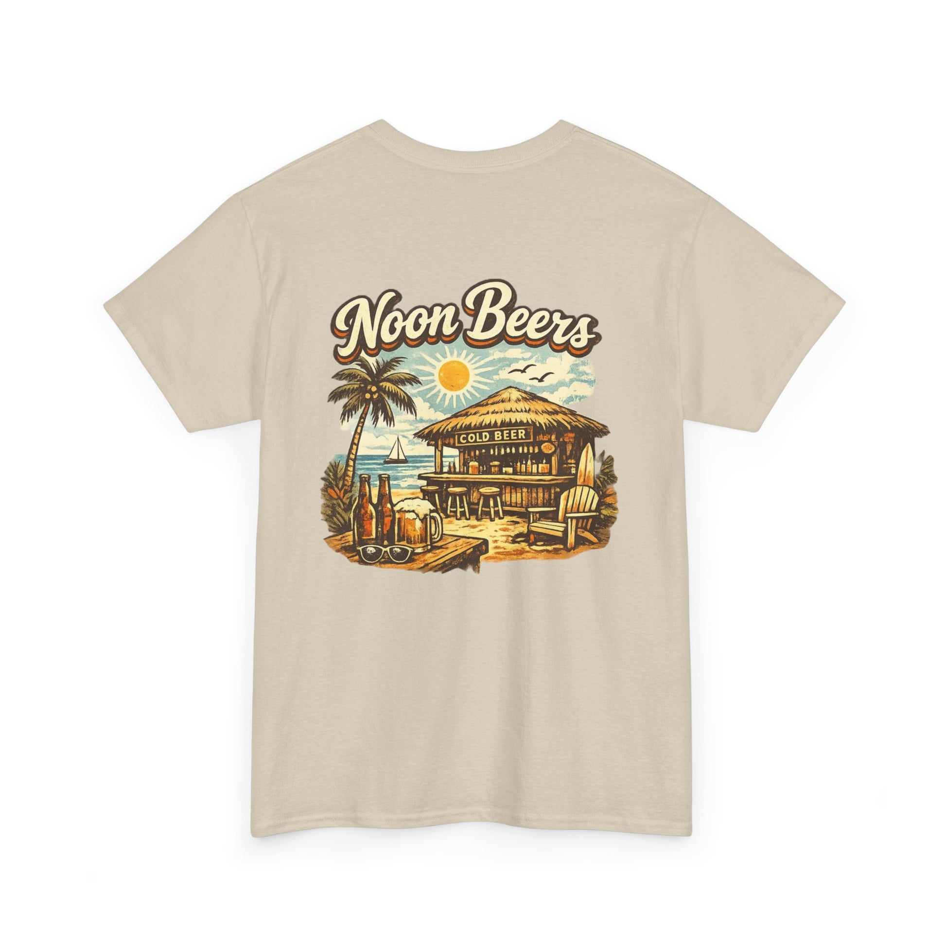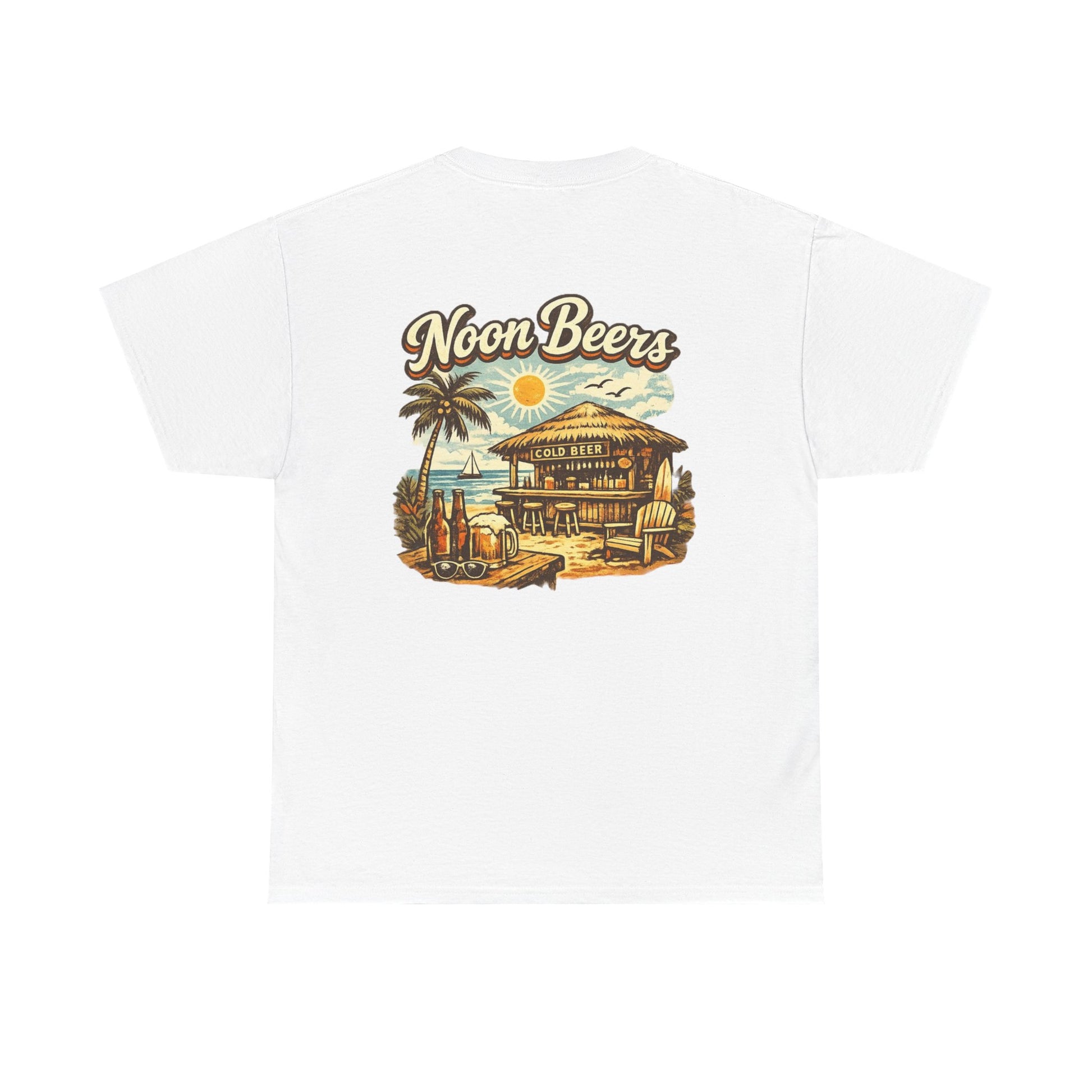 This relaxed cotton tee carries a sunlit, slow-afternoon vibe — a tiny chest logo and a larger, vintage-style back illustration of a beachside tiki shack, palm trees, surfboard, and cold beers. The art feels warm and nostalgic: weathered inks, muted golds and sea-glass tones that pair with worn denim or boardshorts. It sits comfortably through long summer days and backyard hangs, the kind of shirt you reach for when plans are to do very little but enjoy the light and company.