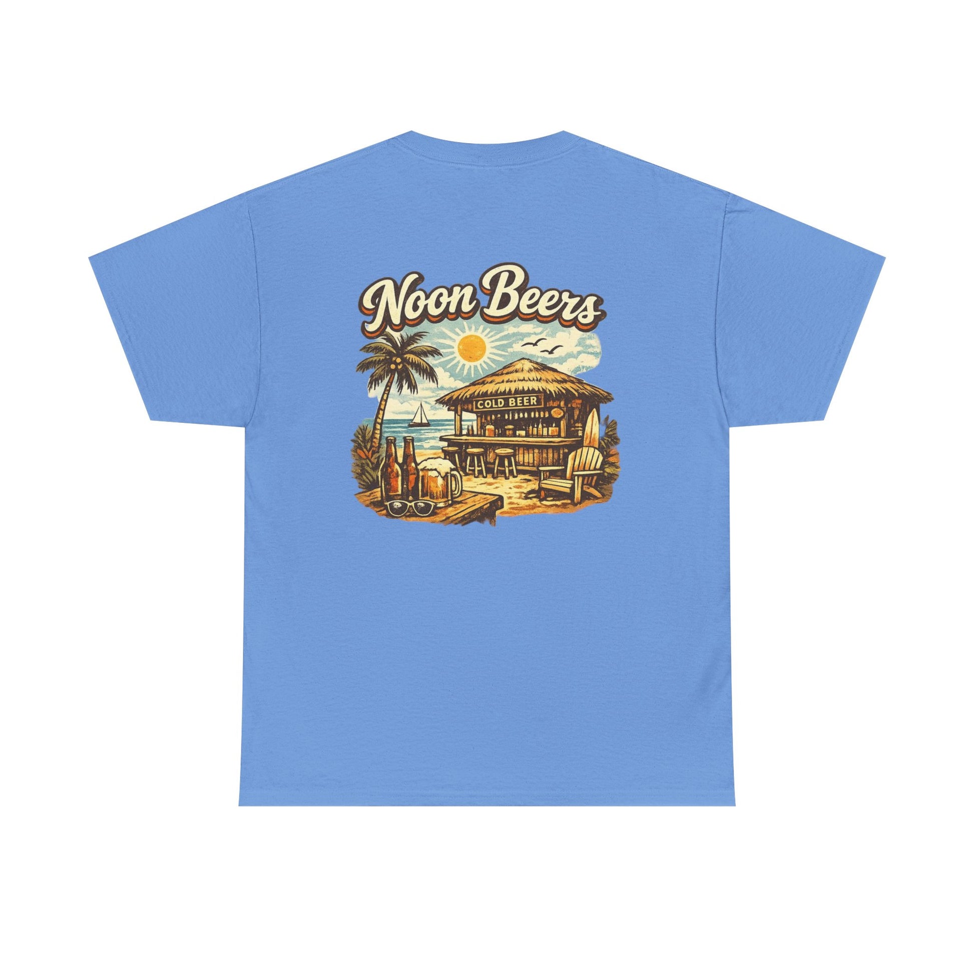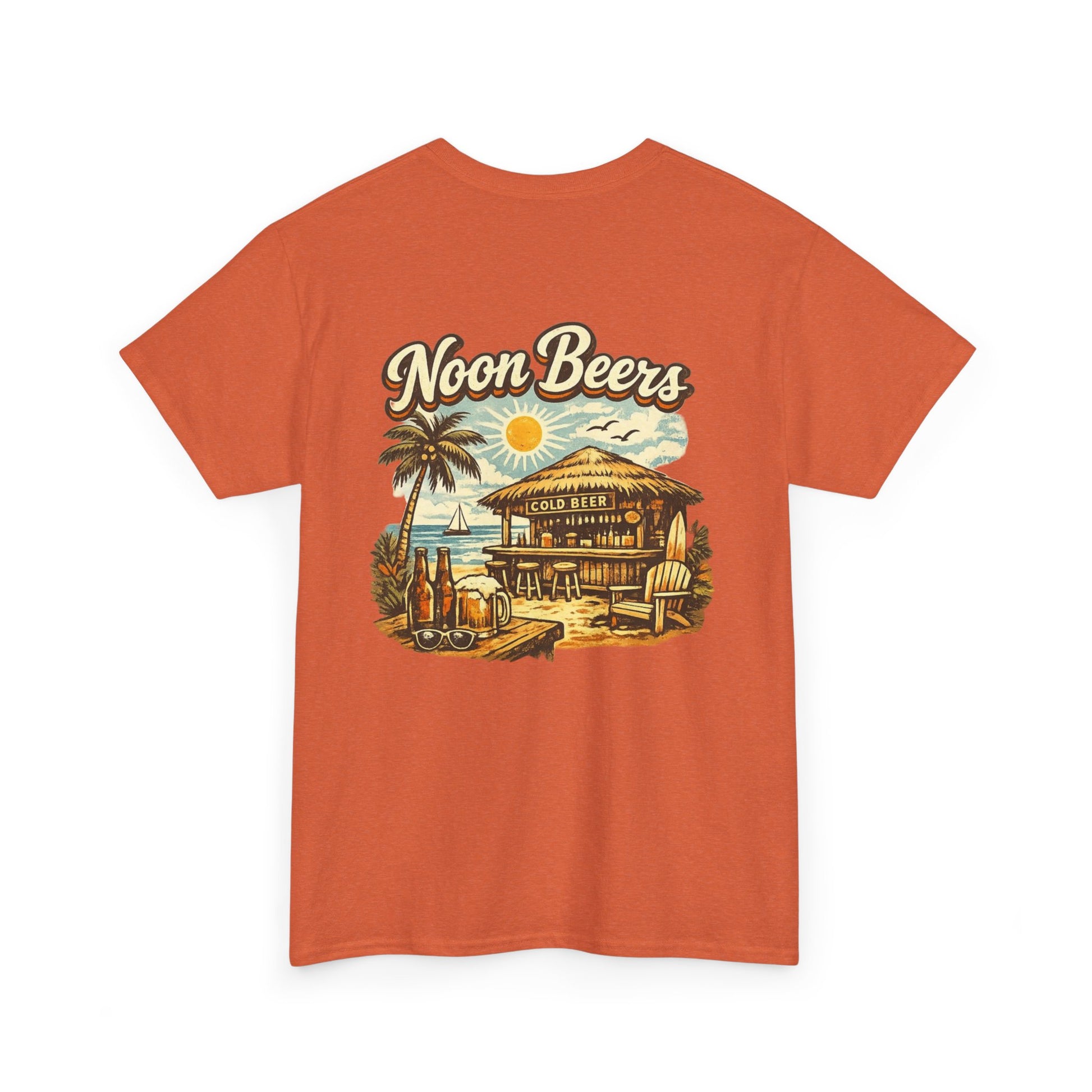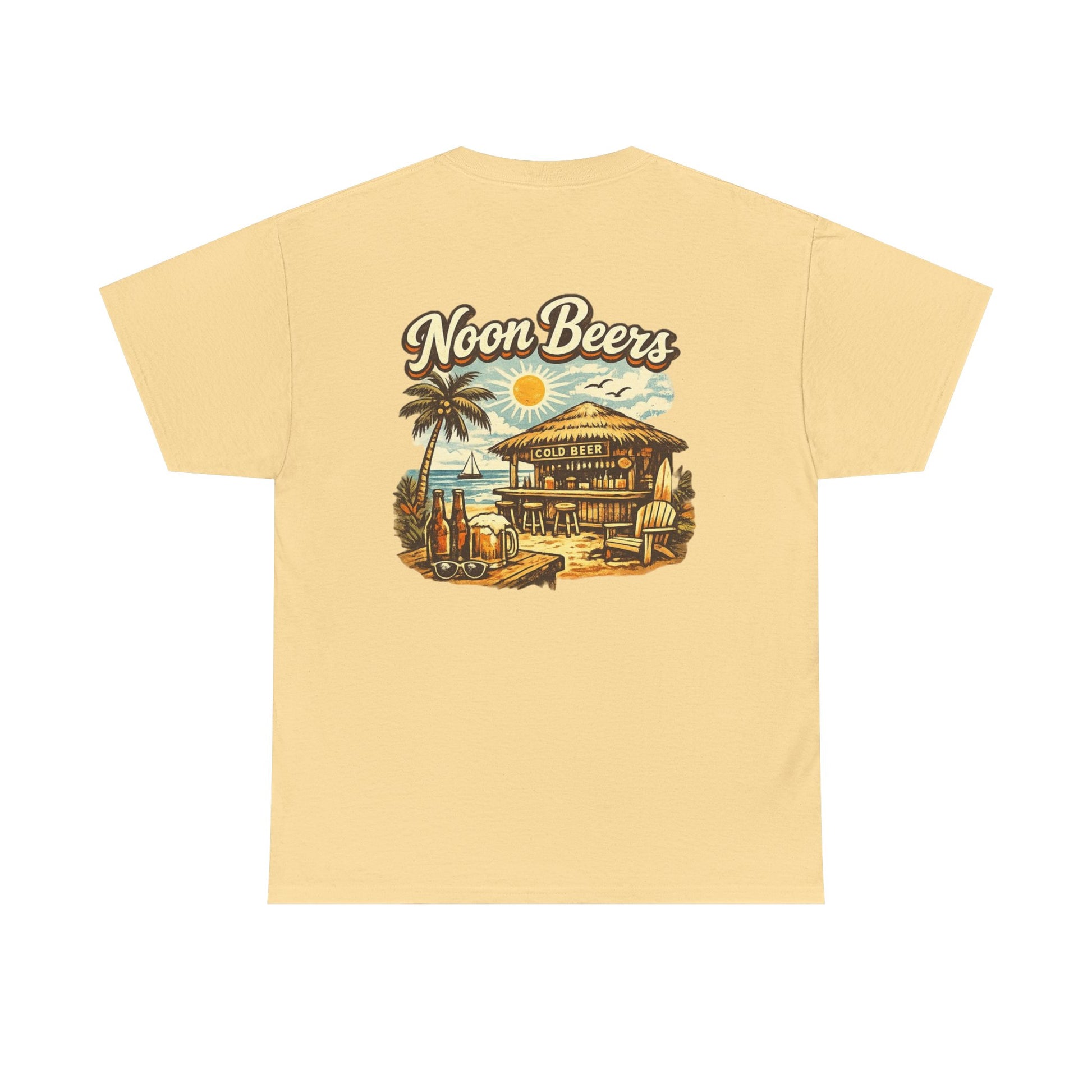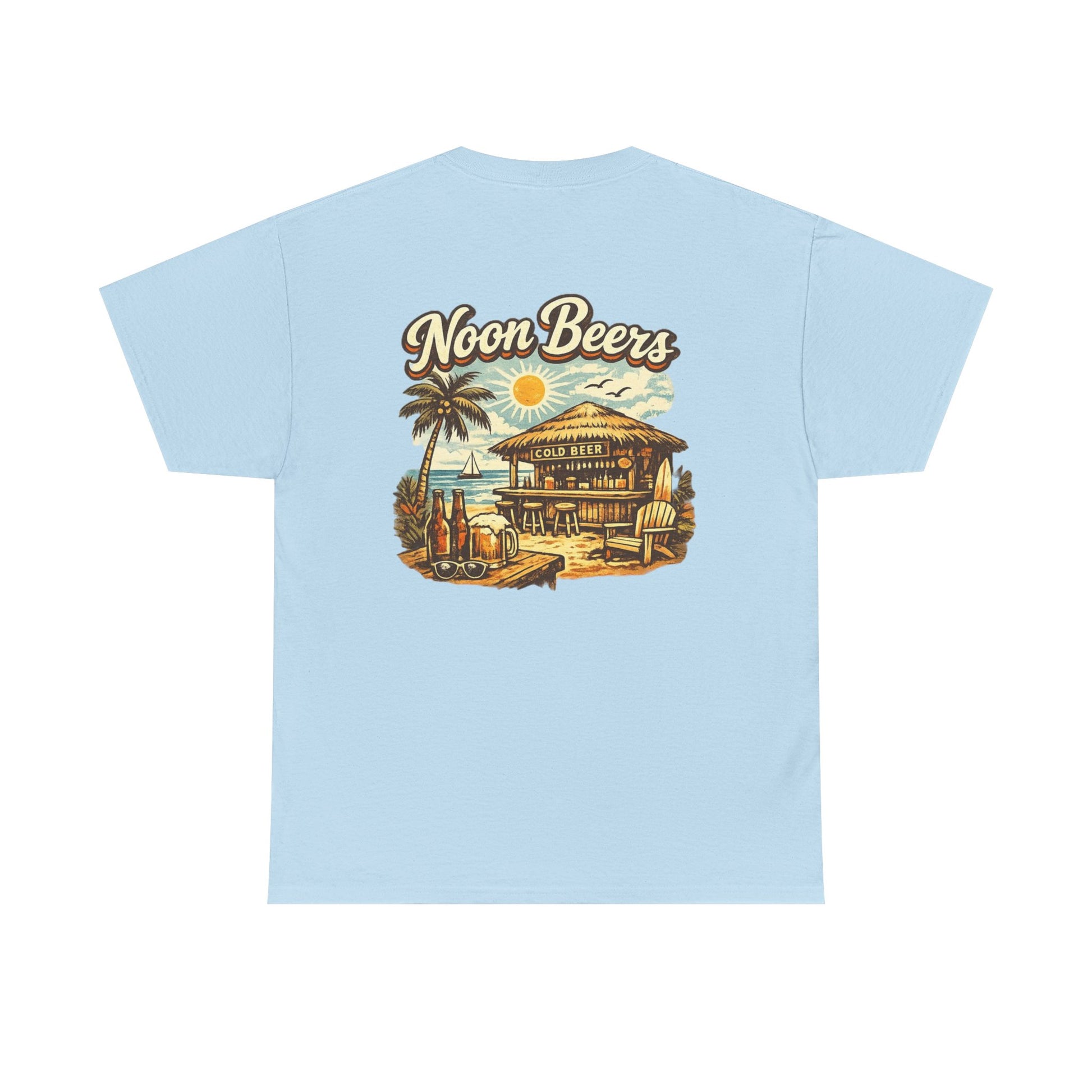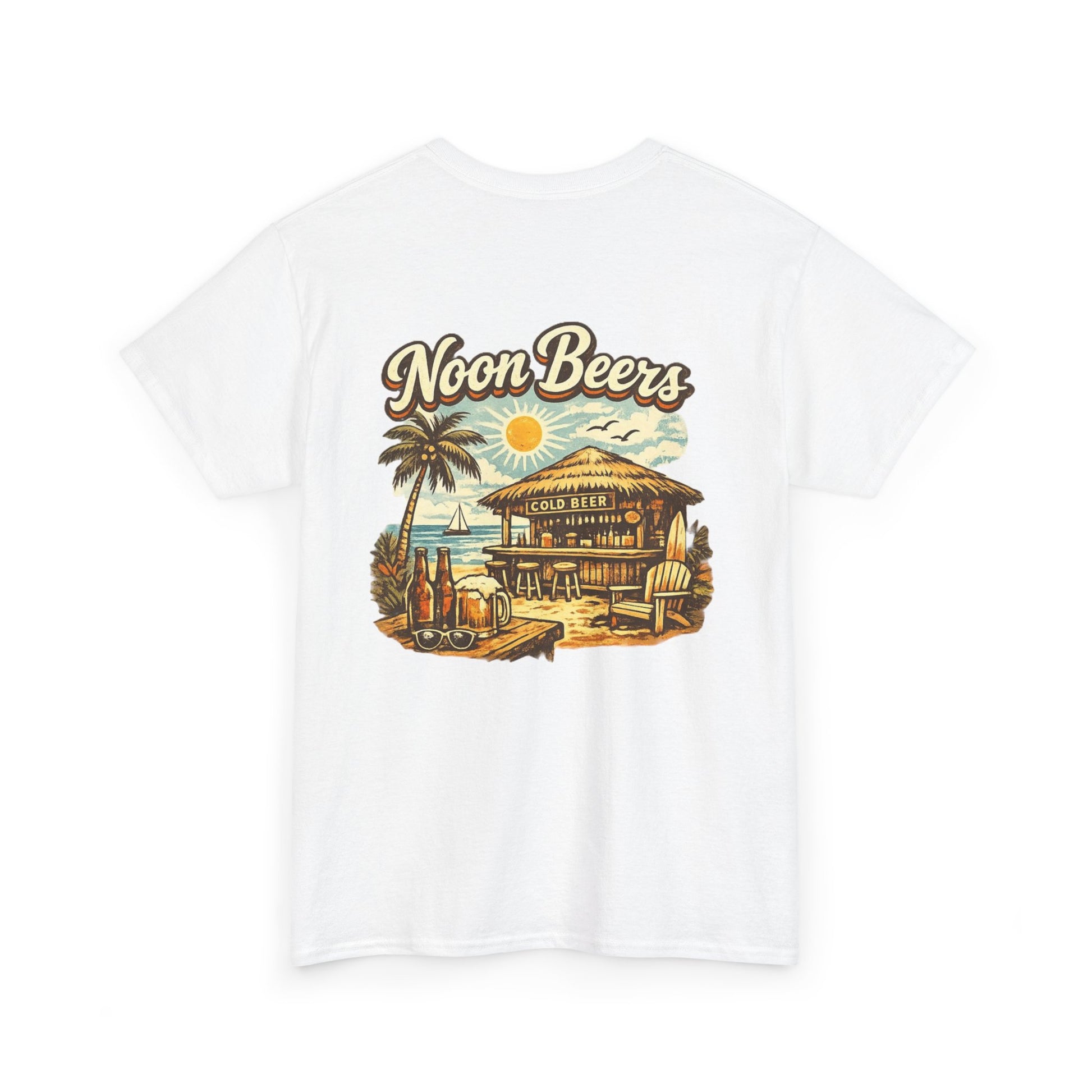 This relaxed cotton tee carries a sunlit, slow-afternoon vibe — a tiny chest logo and a larger, vintage-style back illustration of a beachside tiki shack, palm trees, surfboard, and cold beers. The art feels warm and nostalgic: weathered inks, muted golds and sea-glass tones that pair with worn denim or boardshorts. It sits comfortably through long summer days and backyard hangs, the kind of shirt you reach for when plans are to do very little but enjoy the light and company.